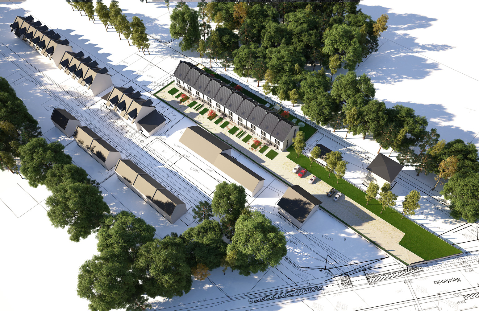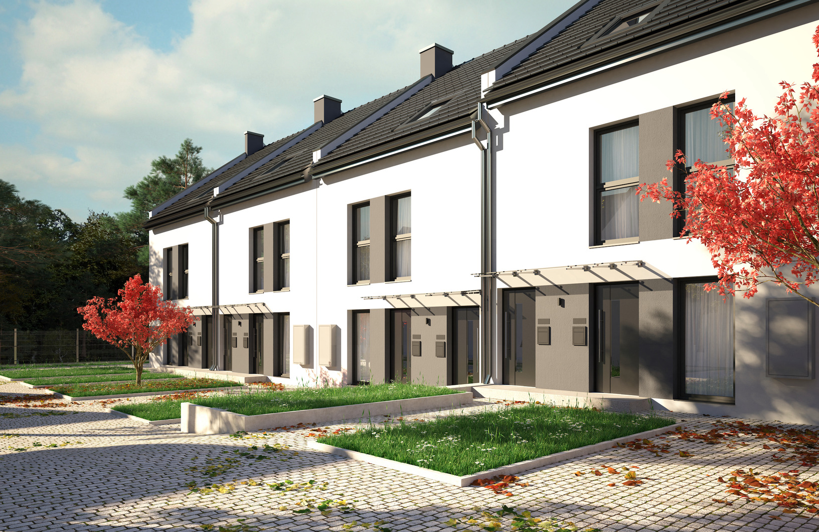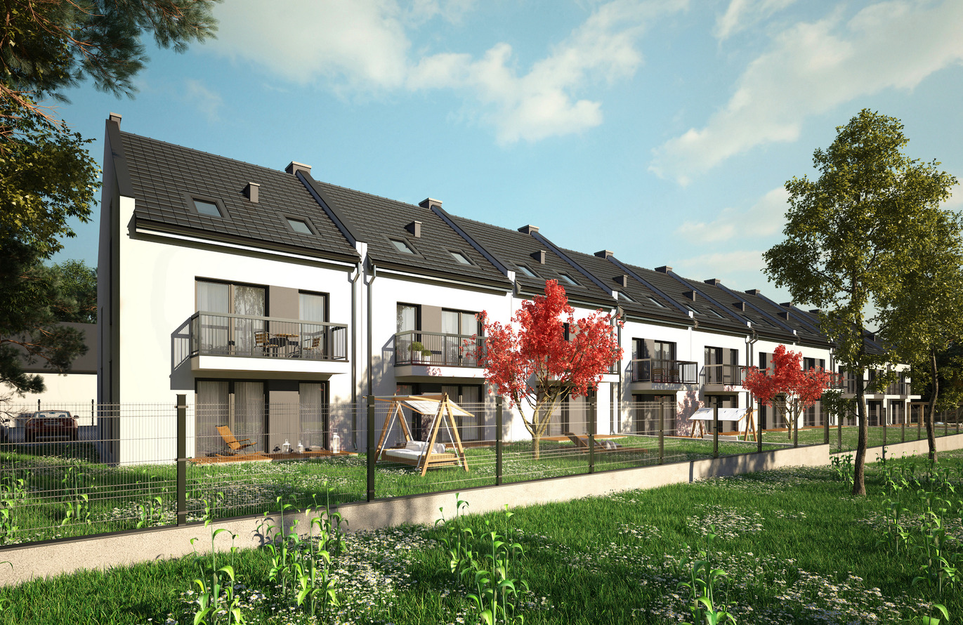 Każdy budynek w zabudowie szeregowej ma dwa lokale mieszkalne, co pozwala na uzyskanie przyjaznej, kameralnej atmosfery.Powierzchnia każdego lokalu na parterze wynosi 54,18 m2, z przemyślanym układem pomieszczeń: salon z aneksem kuchennym, dwie sypialnie, duża łazienka z wanną i kabina prysznicową oraz korytarzem z miejscem na szafę.Lokale na piętrze 99,91 m2 na dwóch poziomach: salon z aneksem kuchennym, 5 sypialni, dwie łazienki.